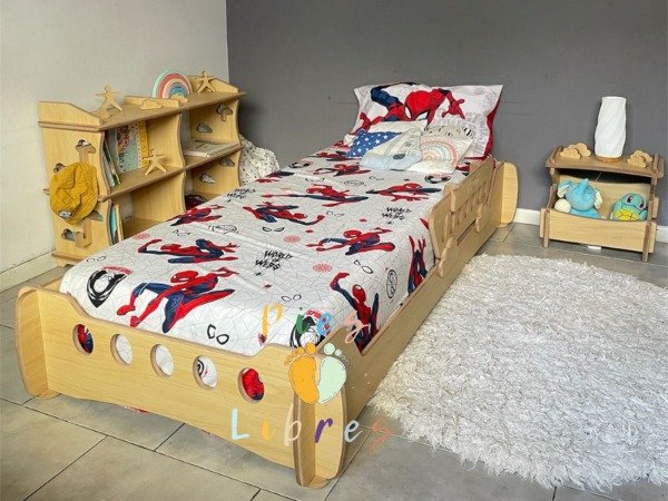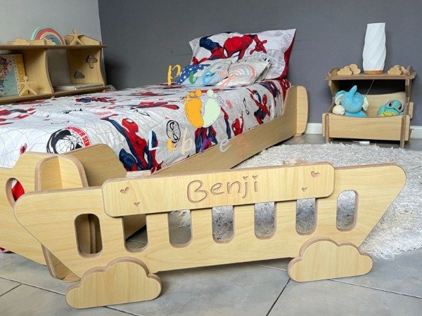 Fabricada en melamina de guatambu sobre mdf de 18 mm, permite pasar de la cuna a la cama de manera segura y divertida. Todos los bordes están lijados y redondeados.